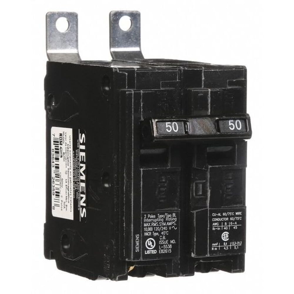 Figure 1: Siemens B250 50-Amp Double Pole Bolt-in Breaker. This image shows the front and side profile of the circuit breaker, highlighting its compact design and terminal connections.