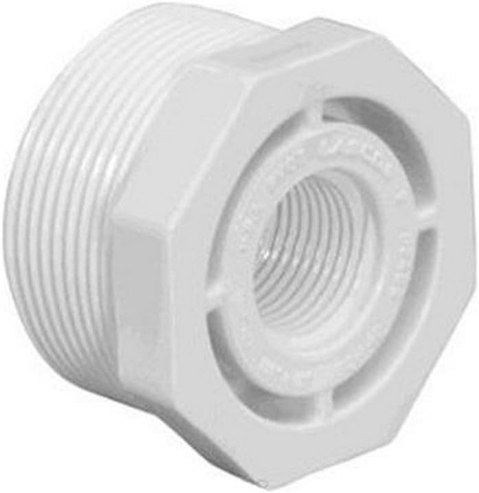 The LASCO 439-250 is a Schedule 40 PVC threaded reducer bushing designed to connect pipes of different sizes. It features a 2-inch Male Pipe Thread (MPT) on one end and a 1.25-inch Female Pipe Thread (FPT) on the other, allowing for a secure and leak-free reduction in pipe diameter within plumbing systems. Constructed from durable Polyvinyl Chloride (PVC), it is suitable for various non-pressure and low-pressure applications.