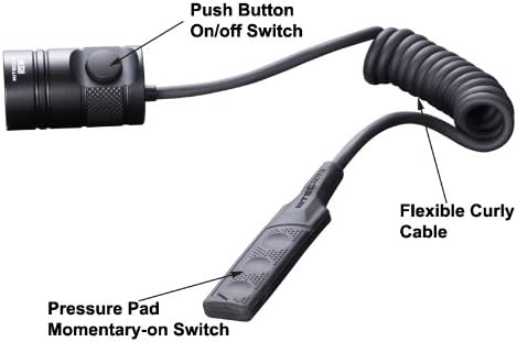 The NITECORE RSW1 Remote Pressure Switch is designed to replace the standard tail cap on compatible NITECORE tactical flashlights. This accessory allows for remote activation and mode control, enhancing usability, especially when the flashlight is weapon-mounted. The coiled cable provides flexibility in placement, ensuring convenient access to the pressure pad.