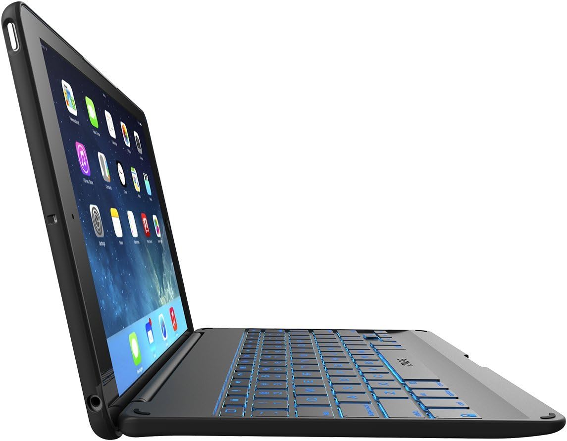 Image: ZAGG Folio Case with Backlit Bluetooth Keyboard for iPad Air, open with iPad screen displaying apps and keyboard illuminated.