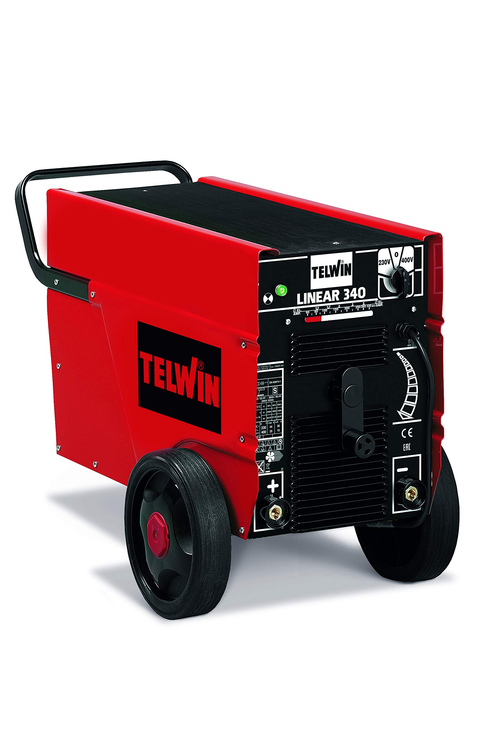 Figure 1: Telwin Linear 340-819020 Welding Machine. This image shows the overall view of the red and black welding machine with its control panel and wheels.