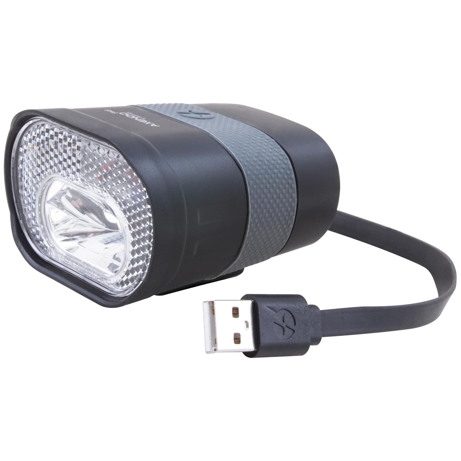 이미지: Spanninga Axendo 40 Lux 자전거 라이트. 본체 라이트와 내장형 USB 충전 케이블이 보인다.