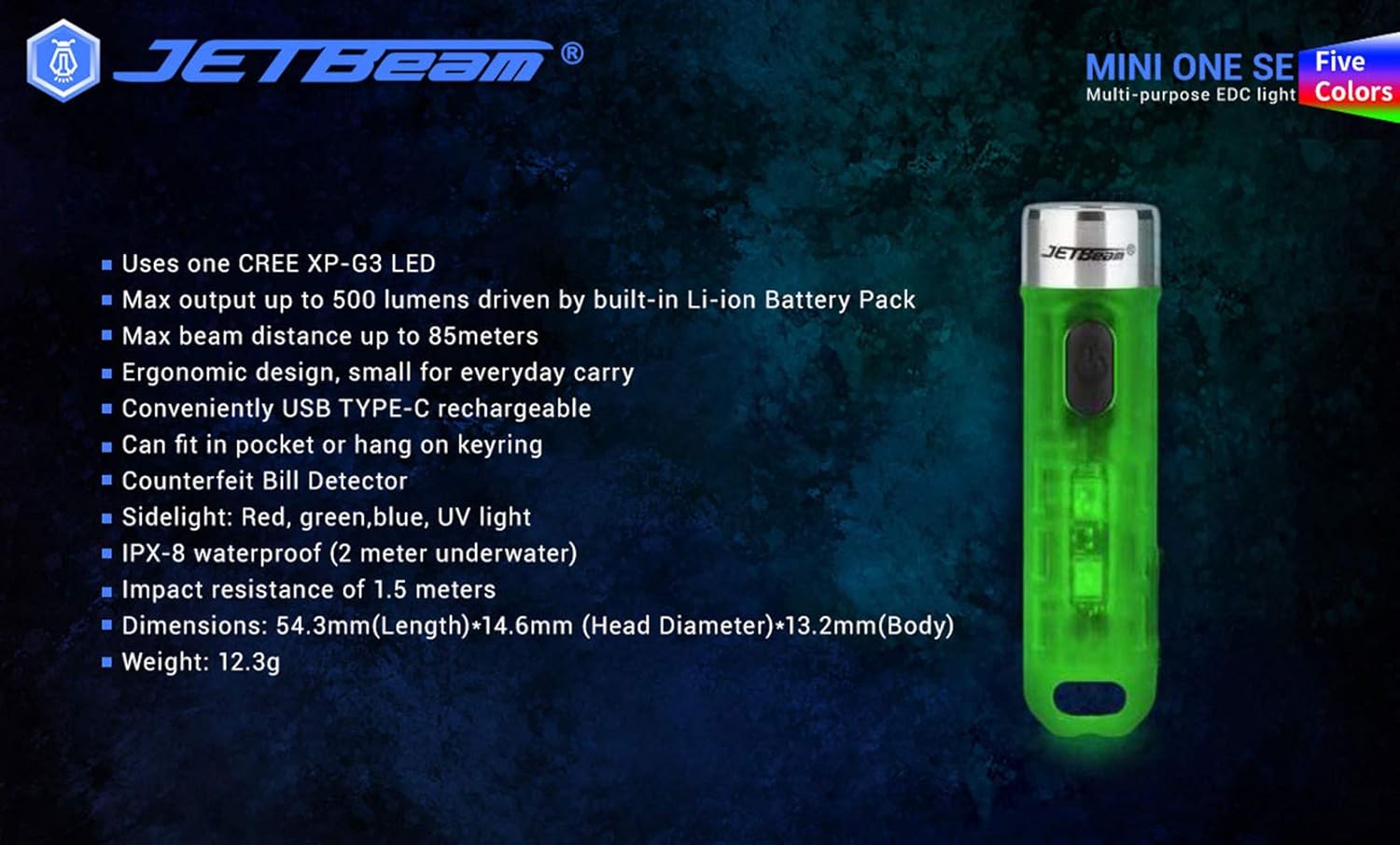 The JETBEAM MINI ONE SE is a compact and versatile keychain flashlight designed for everyday carry. It features a powerful CREE XP-G3 LED for main illumination, along with auxiliary RGB and UV lights for various applications, including fluorescent whitening agent detection. Its durable plastic construction, USB Type-C rechargeable battery, and IPX8 waterproof rating make it a reliable tool for diverse needs.