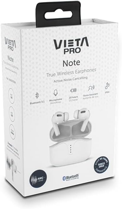 The Vieta Pro Note True Wireless Earphones are designed to provide a high-quality audio experience with advanced features. These earphones utilize Bluetooth 5.1 for stable wireless connectivity, offer Active Noise Cancellation (ANC) up to -30dB, and include an integrated microphone for clear communication. With IPX4 water resistance, they are suitable for various activities. The charging case extends the total battery life to up to 20 hours.