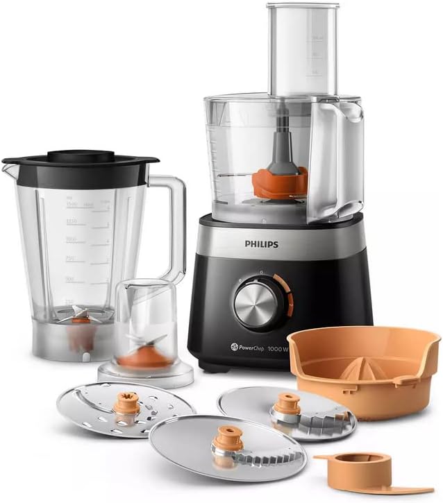 - 8가지 다재다능한 액세서리: Includes S-Blade, 2L Blender Jug, Slicing and Grating Disc, Julienne Disc, Potato Chips Disc, Citrus Juicer, Kneading Tool, and Grinder.
