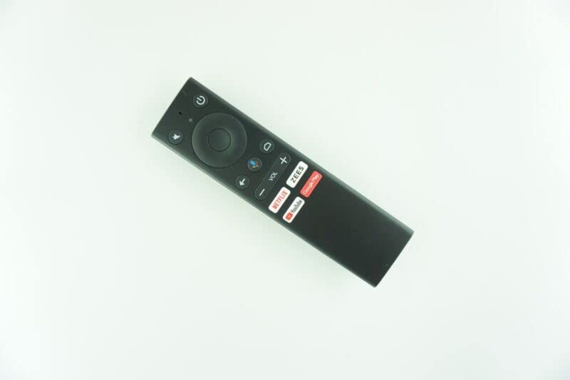 Image of the black replacement remote control. It features a power button, mute button, navigation pad, back button, home button, voice control button, volume up/down buttons, and dedicated buttons for Netflix, ZEES, YouTube, and Google Play.