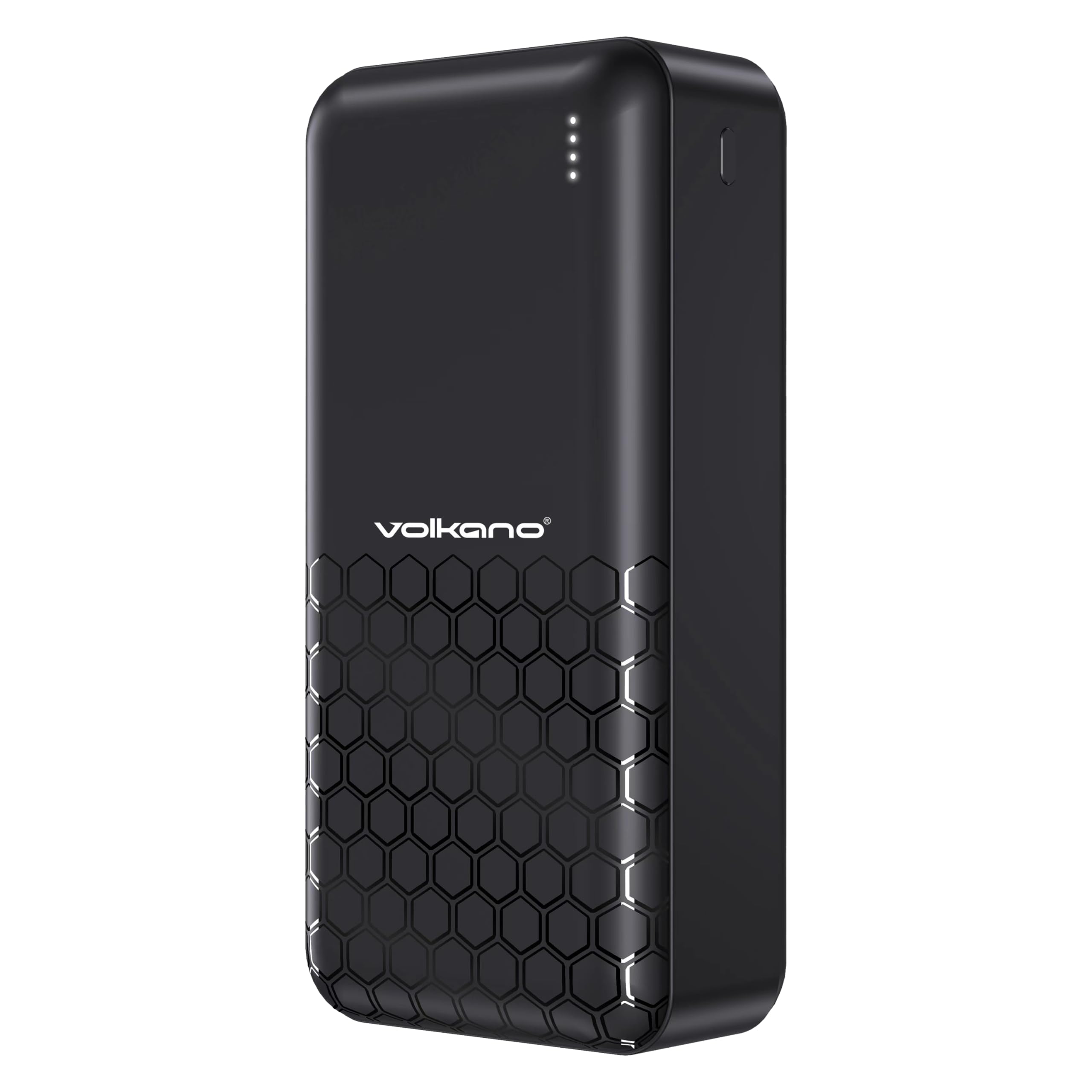앞쪽 view of the Volkano Remus power bank, displaying the Volkano logo and four LED indicator lights.