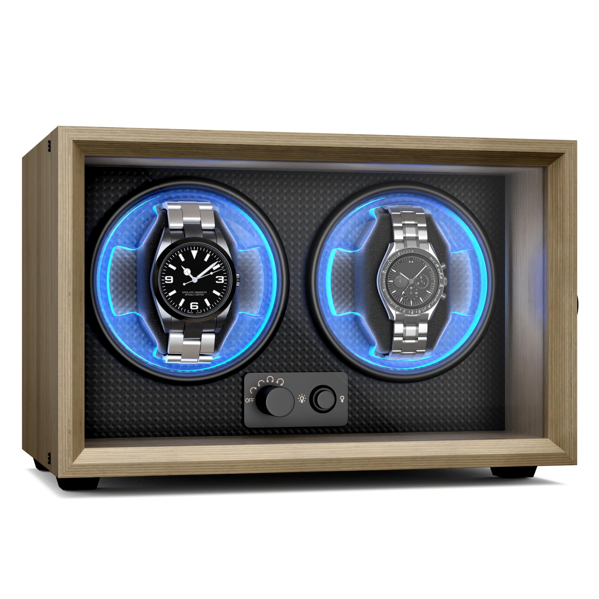 This elegant watch winder features a high-quality wooden design with an acrylic door, showcasing up to two of your finest automatic watches. Integrated blue LED lighting enhances the display, making your watch collection a focal point in any room. The winder operates with an ultra-quiet motor, preventing disruptive noise. It offers multiple rotation settings to accommodate various watch specifications.