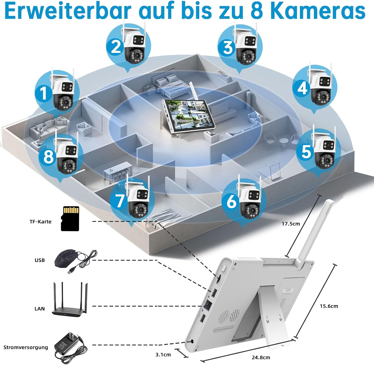 영상: 오버헤드 view of a house layout showing the NVR monitor in the center and eight cameras (two included, six expandable) strategically placed around the property. The NVR's ports for TF card, USB, LAN, and power are also depicted.